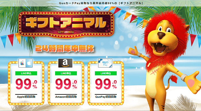 換金率や振込スピード、信頼性や深夜対応など様々な視点から確認しても利用者の評価はトップクラスの買取業者!!振込時間も驚愕の最短5分。二回目以降でお買取り率が低くなってしまう場合もLINEからのお申込みで1.0%もアップいたします。QuoカードPayを売却するならギフトアニマルがおすすめです。